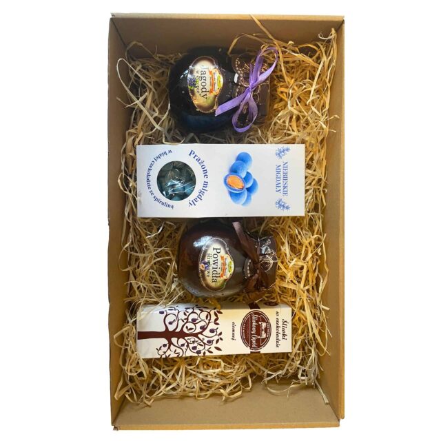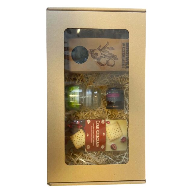 Zestaw prezentowy z półsłodkim winem, kawą, batonem i czekoladą z orzechami